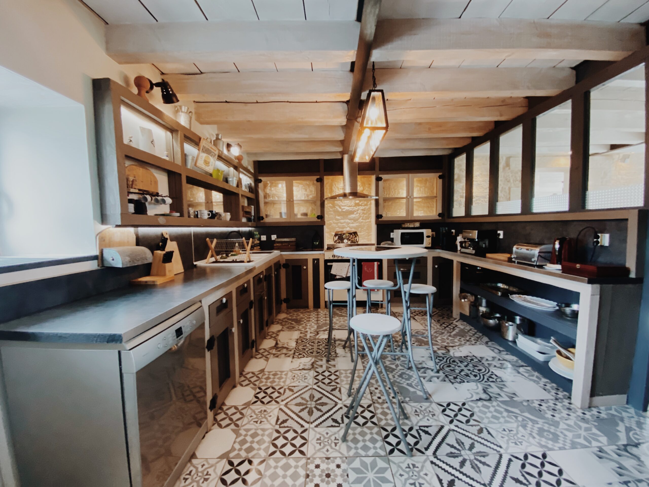 Les espaces de vie ont été pensés pour favoriser les moments de partage et de convivialité. Le salon, chaleureux et lumineux, est équipé d’une télévision avec Chromecast, idéale pour se détendre après une journée de découverte ou de repos. La salle à manger, spacieuse, permet d’accueillir l’ensemble des convives autour de grandes tablées, tandis que la cuisine entièrement équipée vous offre tout le nécessaire pour cuisiner librement et profiter pleinement de vos repas sur place, comme à la maison.